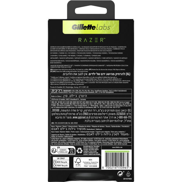 Level up your shave with the GilletteLabs × RAZER Limited Edition Razor, featuring a premium metal handle, one refill blade and a design crafted for performance, precision and style. Built with 5 ultra-sharp blades, this razor delivers a close, smooth shave with minimal effort, while the ergonomic finish provides full control during every stroke.